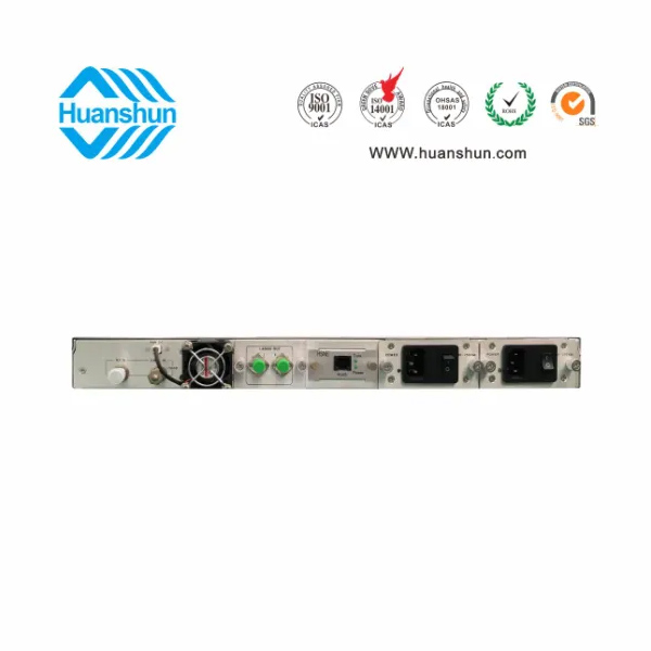 RF80 ± 5 dBuv 輸入,ITU 1550nm,  ≥ 2 × 7、9、11 dBm 輸出,SBS13、16、19可調;1U標準機箱,雙模塊熱插撥電源,AC90 ~ 255V或DC-48V供電,RJ45標準網管(支持SNMP、WEB)