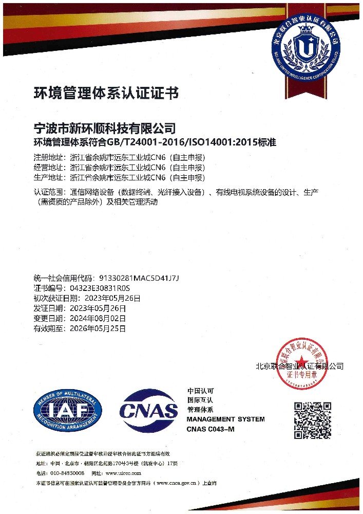 ISO14001 環(huán)境管理體系證書(shū)